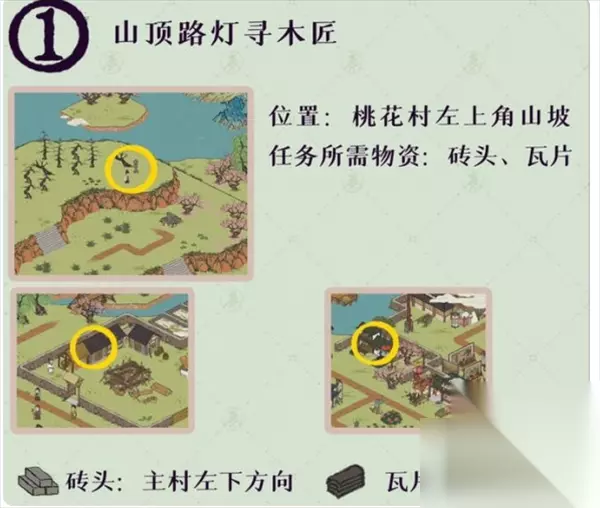 ?桃花村最后的故事是江南百景图游戏中近期更新的关卡,很多小伙伴还不清楚这一关的解密方法,那么江南百景图桃花村最后的故事怎么解?下面233乐园小编带来,希望可以帮助到大家。 任务所需物资:砖头、瓦片 位置:桃花村左上角的山坡