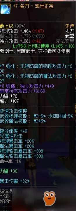 NO.7 名刀——观世正宗 名刀外貌普通,之所以强大是因为它为自带高额的暴击几率的提升以及32%的暴伤加成,极大的弥补了鬼剑士暴击低的劣势。