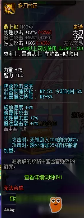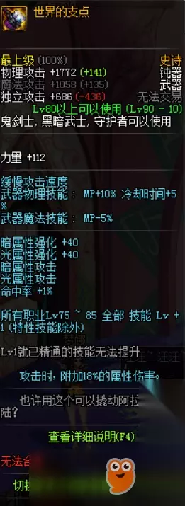 NO.2世界的支点 很多人都没有想到吧,第二竟然是世界的支点,虽然它是钝器,但是你可千万不要小瞧了它,这把武器的逆天的地方就是18属性附加伤害,不如回头想想86版本的幽魂吧,就知道它有多么可怕。