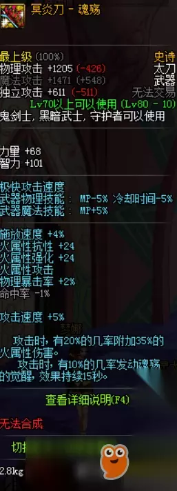 NO.8 冥炎刀——魂殇 作为之前版本红眼最钟爱的太刀,在新版本也有很高的地位。魂殇,凭借着攻击时附加X%火属性伤害的核心属性被大家称之为“火刀”。也有玩家戏称为“天下第一刀”。