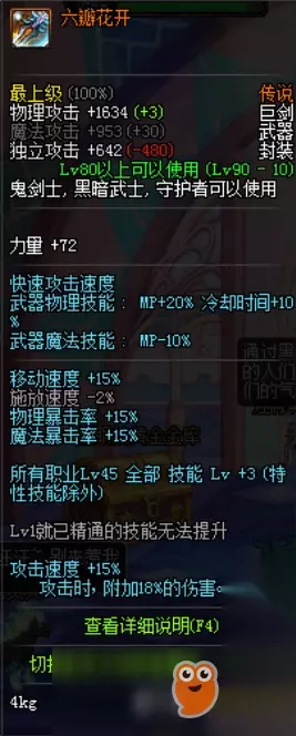 NO.6 圣剑——王者之剑 这是新版本中强大的一件神奇,它受欢迎主要是因为有着加18%的技能伤害以及100的全部属强,使得这一把新出的90神兵成为了众多人的毕业武器,但缺点就是它是巨剑。