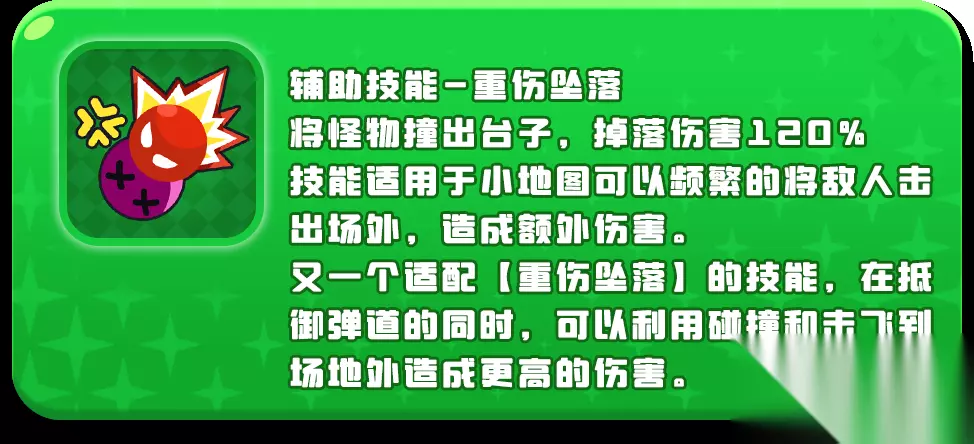 辅助技能:重伤坠落 将怪物撞出台子,掉落伤害120% 技能适用于小地图可以频繁的将敌人击出场外,造成额外伤害。 又一个适配【重伤坠落】的技能,在抵御弹道的同时,可以利用碰撞和击飞到场地外造成更高的伤害。