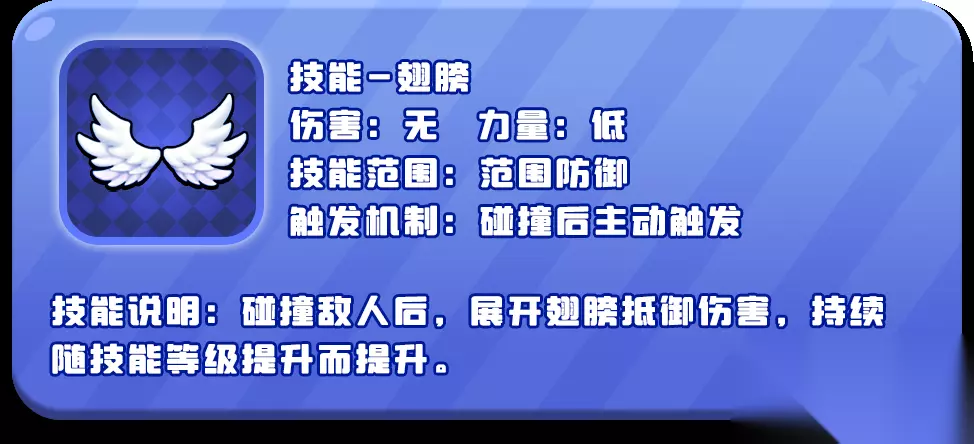 技能-翅膀 伤害:无 力量:低 技能范围:范围防御 触发机制:碰撞后主动触发 技能说明:碰撞敌人后,展开翅膀抵御伤害,持续随技能等级提升而提升。