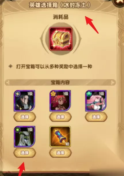 3、可能查看奖励,共有8个6小时的英雄经验、8个8小时的挂机粉尘以及10个抽卡券。 4、通关后可以获得英雄选择箱,背包中点击可以获得英雄选择箱,然后选想要兑换的英雄,或是种族十连抽。 5、选择完毕后可以获得对应的英雄奖励。