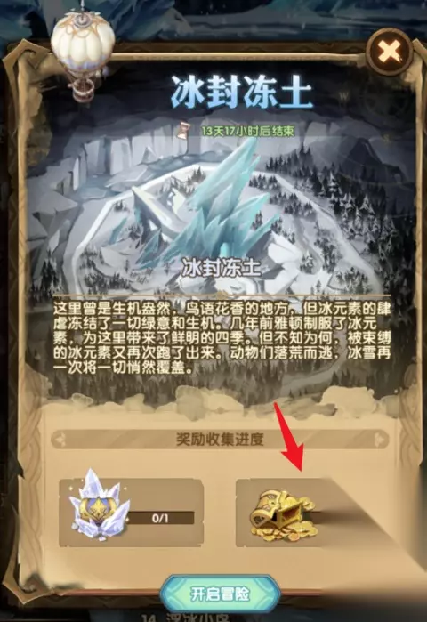 剑与远征冰封冻土奖励介绍 1、打开游戏后,点下面界面上的野外,点奇境探险。然后选冰封冻土进入。 2、我们可以看到右边的宝箱。