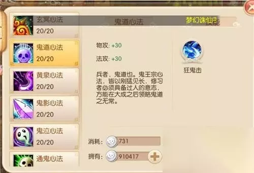 鬼王宗心法包括玄冥心法、鬼道心法、黄泉心法、鬼影心法、鬼泣心法、通鬼心法这6个。每个心法除了有对应的技能外,还可以为角色带来属性的提升。比如玄冥心法有乱鬼斩和鬼斗技能的同时,可以增加角色气血。 玩家最有必要升级的心法肯定是玄冥心法了,这是门派的主心法,决定门派其他心法的等级上限。玄冥心法乃鬼王宗的无上天书,鬼王宗弟子参习鬼门法术,聚玄冥之力为己用,此乃鬼王宗名称之由来。可见学习玄冥心法是是所有心法的基础。 不同的心法对应不同的技能,而技能的类型一般分成攻击技能,辅助技能和控制技能。攻击技能不论是做任务还是与其他玩家PK都非常重要,而辅助技能和控制技能往往是对面玩家PK的,所以玩家如果是喜欢做任务而不喜欢PK的话,那就可以剩下学习控制技能的资源专心学习攻击和辅助技能了。