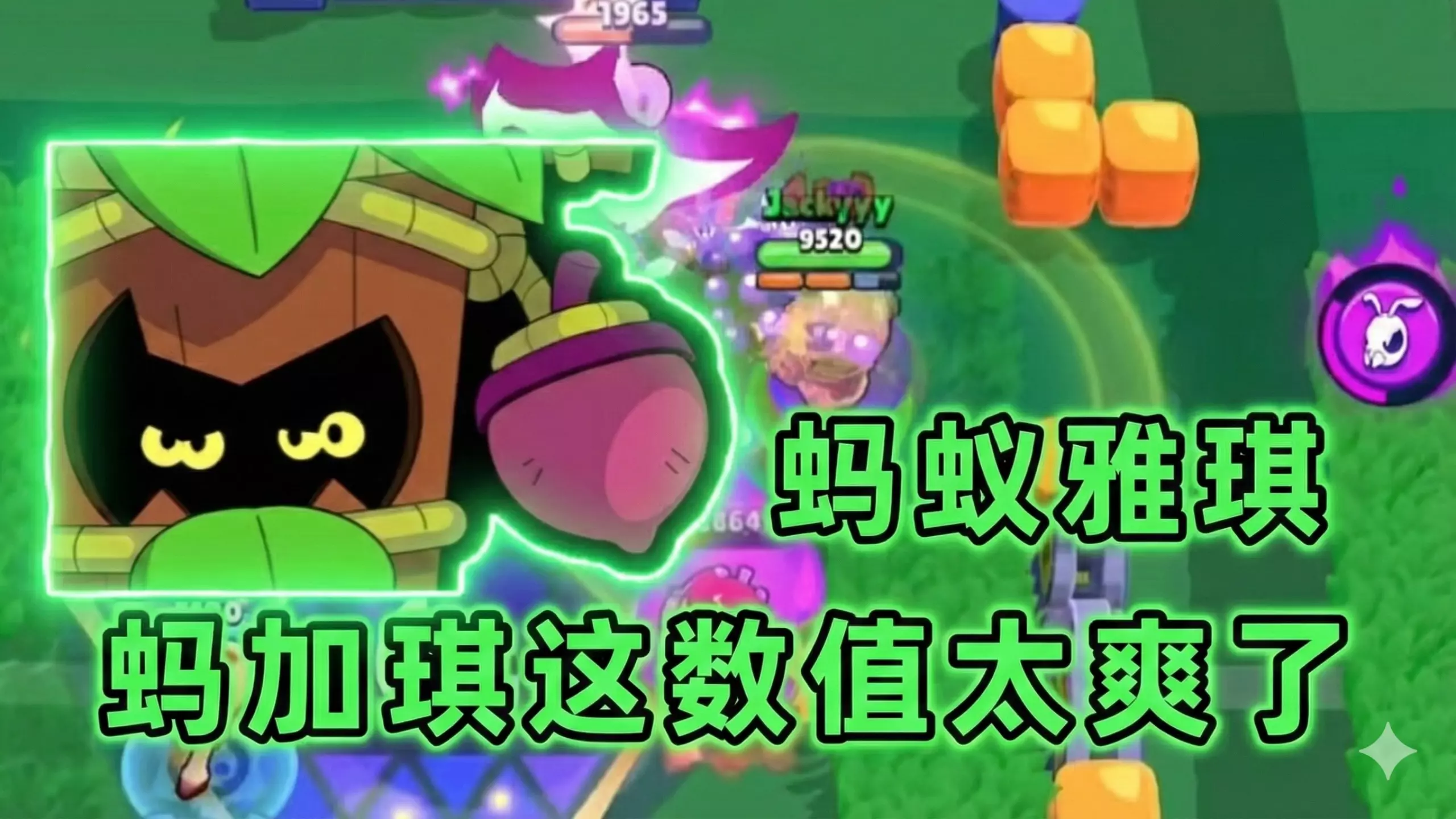 这是《荒野乱斗》的游戏内容,流浪者展示新投掷角色的强势表现,该角色强度超模,甚至能贴脸对战雅琪,还展示了角色的星徽技能,最终取得对局胜利。
