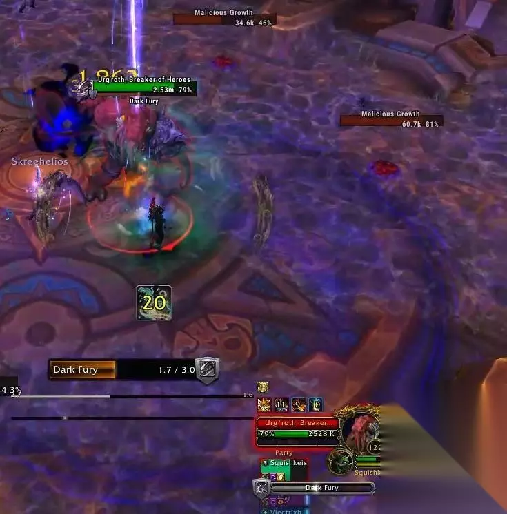 勇士歼灭者乌格罗斯 l 裂魂人:对目标造成巨额物理伤害,并留下一个受到伤害提高100%的debuff,持续8秒。 l 黑暗之怒:3秒读条的一个范围技能,会对范围内的玩家造成约15w的暗影伤害。 l 恩佐斯军团:召唤大量恶毒之种,有点类似于戈霍恩传球那的小怪。恶毒之种只有7W左右的血量,如果不将其击杀的话,会在12码范围内施放腐化地面,在地面上的玩家每秒受到1.2w伤害并减速65%。
