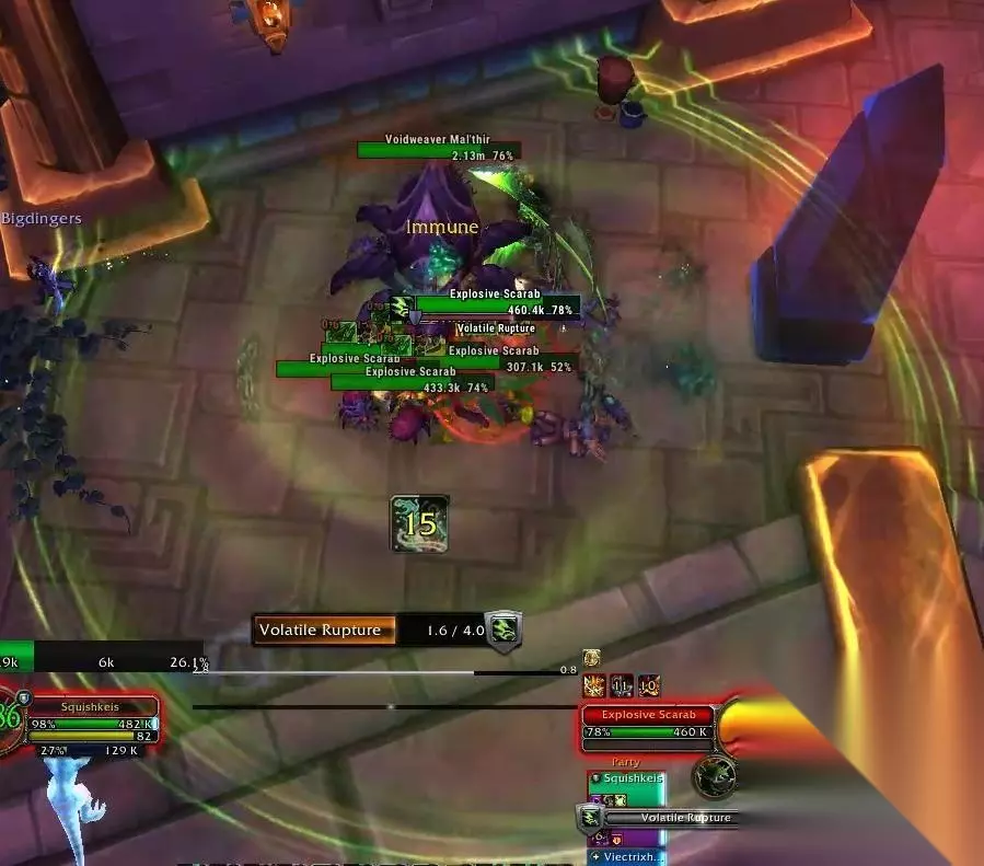 腐化者之血 l 污秽之地:随机在两名玩家的位置生成污秽地面。玩家站在地面上将会每秒受到6w伤害,当腐蚀者之血死亡时,污秽地面才会消失。 l 恩佐斯军团:召唤出5只触手怪,触手怪会对随机目标施放心灵鞭笞,每秒造成9K伤害,并减速65%。
