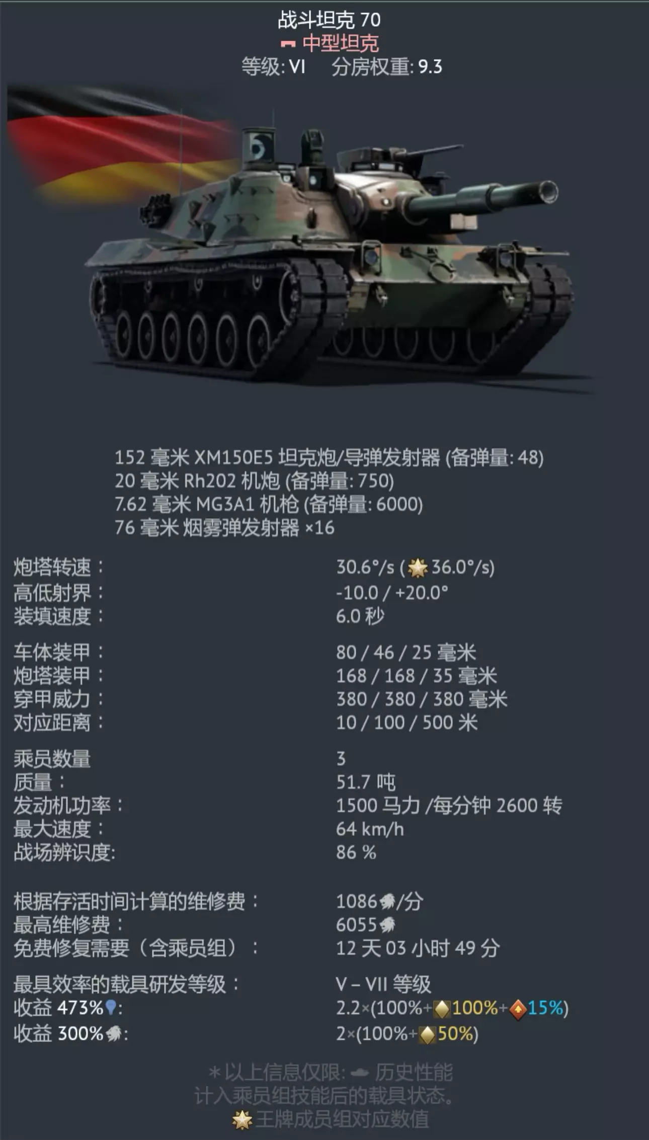 当时华约拥有庞大的装甲部队,在坦克数量与质量占据优势的情况下。在这一威胁下,北约需要研制性能先进的主战坦克以抗衡华约的“铁甲优势”。 1963年12月,美德双方确定研制坦克的战技指标。1964年9月,设计工作全面铺开。1965年2月开始实车设计。1966年6月美国制造的第一辆测试车底盘准备就绪,1966年9月德国的也准备就绪。1968年初,MBT-70原型车开始正式的全面测试。1969年德国因项目超预算退出,美国继续研发至1971年项目最终取消。 kpz70车体上加装了当时颇为先进的设备,包括但不限于:稳像式火控系统,采用液气式悬吊系统等。 在游戏中,kpz70装备一台1500马力的MTU公司的MB873Ka型水冷12缸多燃料发动机,前进极速64km/h,倒退极速64km/h,功重比为28.9,转场能力优秀。 王牌车组情况下,水平瞄准速度36.0°/s,垂直瞄准速度25.0°/s,拥有双向稳定器,反应速度优秀。 仰角和俯角分别为+20°和-10°,拥有液气悬挂,勾子撅起来能达到惊人的-20°俯角(猜的),地形适应能力优秀。 主炮为一门152毫米XM150坦克炮,缩放倍率为7-14倍,采用自动填装,填装速度6.0秒,填装导弹时为17秒,可以发射285穿的XM578E1和432破的MGM-51C,拥有激光测距仪,火力方面优秀。 装甲方面,作为一辆北约坦克,承袭了德国冷战一向的皮薄馅大,正面免疫20机炮的扫射,脑袋相对之前的坦克有了一定抗穿能力。拥有烟雾弹,挨揍时可以依靠64的倒车速度快速逃离战场。 6秒一发的285钢针在9.3脆皮居多的权重非常好用,20机炮也可以当做火力补充,7-14倍缩放的炮镜近战和狙击都非常不错,哎呀,这辆车我太喜欢了,怎么玩怎么舒服,绝对是德国9.3扛把子的存在,太喜欢了这个😊#武器装备 #军事 #仅个人见解及分享 #战争雷霆 #游戏 #坦克世界闪击战