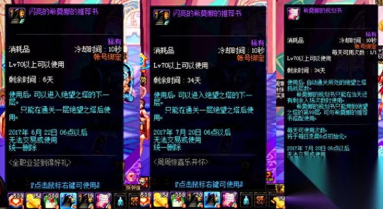 DNF地下城与勇士5月25号更新的日常签到活动马上就要结束了,而活动的第21次签到奖励里有20张闪亮希莫娜的推荐书还有很多勇士没有用。加上周常签到5到8周也有40张推荐书,一共是60张,但是有很多勇士说屯了这么久准备用的时候发现用不了,以为遇上了BUG,那么下面小编就来说下正确的使用方法。