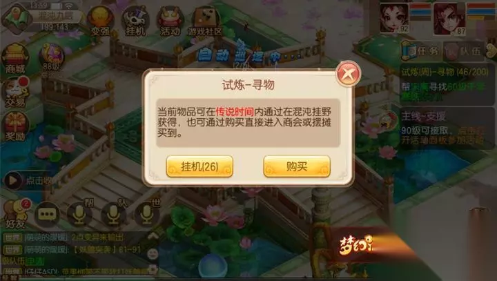 一部分玩家抱怨试炼难做的原因在于寻物任务需要耗费太多的资金去购买NPC所需的各类物件,从而一趟下来即使算上获得的奖励也是笔亏本的买卖。其实试炼的寻物任务最好解决办法就是通过在混沌时空挂机来获得任务物品,并且只要玩家在挂野的过程中队伍人数越多那么获得传说物品的几率也就越大,从而完成试炼任务的成本就会小上很多。