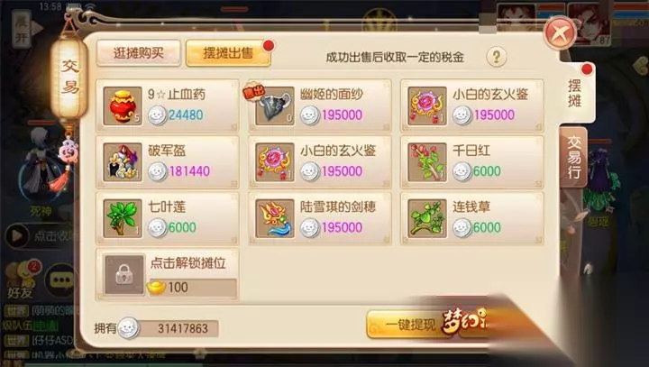 玩家在混沌时空挂机时可以获得各种各样的道具,虽然这些道具在品质上并不算高,但是对于玩家来说却是日常任务中所需的,所以玩家在打到这些道具后可以自行摆摊出售,这样就可以将修理装备损失的银币补回来了(在摆摊上架物品时可以先去看下当前市场的行情,根据别人的售价自行更改上架金额可以让自己的道具卖的更好)。 【试炼—寻物需要挂野来完成】