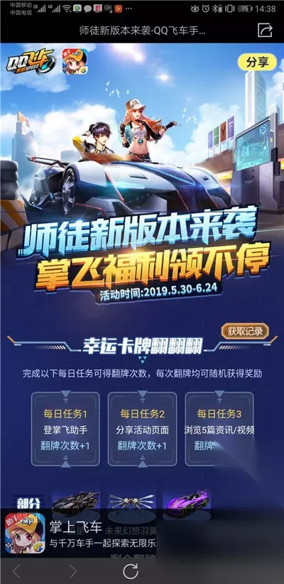 在安装完成之后先在掌上飞车软件中绑定我们的游戏账号及角色,然后回到分享页面点击在APP中打开。 这时系统会自动拉取掌上飞车的信息,这时我们就可以获得翻牌次数了。