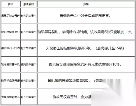 1、天赋1(普通攻击·千金掷) 普通攻击 发射宝石,造成岩元素伤害。 命中时,赋予凝光一枚星璇 重击 消耗体力,发射一颗巨型宝石,造成岩元素伤害。 若凝光拥有星璇,施放重击时会将所有星璇一同发射,造成额外的伤害 下落攻击 凝聚晶岩的力量,从空中下坠冲击地面,攻击下落路径上的敌人,并在落地时造成岩元素范围伤害 备注 普通攻击会发射两枚宝石,分别造成等同于普通攻击倍率的伤害。 普通攻击的动作时间约为0.93秒,但普通攻击时按住方向键可降低普通攻击的动作时间至0.83秒左右(有浮动),另外重击的动作时间约为1.43秒。 普通攻击的两枚宝石分别命中不同目标或不同时命中同一目标可一次积攒两枚星璇,有微小的时间差即可。 2、天赋2(璇玑屏) 阻挡敌人发射的投射物; 耐久度按比例继承凝光的生命值上限 璇玑屏被视为岩元素创造物,可以阻挡部分攻击,不可攀爬。同时只能存在一个 注:璇玑屏存在时间为30秒;实测表明,璇玑屏造成伤害时,每6秒只能产生一次元素微粒。 3、天赋3(天权崩玉) 凝光在身边凝聚诸多宝石,散之一瞬,自动索敌打击附近的敌人,造成大量岩元素伤害。 施放天权崩玉时,如果附近有璇玑屏存在,璇玑屏将发射额外的宝石飞弹协同攻击。 备注:大招会产生6个宝石。如果存在璇玑屏,则会额外产生6颗宝石,在大招放完后释放,同时璇玑屏将会碎裂。此碎裂可以触发第二命座效果。 4、天赋4(星移势转) 拥有星璇时,凝光的重击不会消耗体力。 5、天赋5(储之千日,用之一刻) 穿过璇玑屏的角色会获得12%岩元素伤害加成,持续10秒。 6、天赋6(奇石珠宝录) 在小地图上显示周围能产出锻造用矿石的矿脉位置。 备注:锻造用矿石指铁块、白铁块、水晶块、魔晶块、星银矿石、紫晶块。 20级突破材料:坚牢黄玉碎屑*1、琉璃百合*3、新兵的徽记*3 40级突破材料:坚牢黄玉断片*3、玄岩之塔*2、琉璃百合*10、新兵的徽记*15 50级突破材料:坚牢黄玉断片*6、玄岩之塔*4、琉璃百合*20、士官的徽记*12 60级突破材料:坚牢黄玉块*3、玄岩之塔*8、琉璃百合*30、士官的徽记*18 70级突破材料:坚牢黄玉块*6、玄岩之塔*12、琉璃百合*45、尉官的徽记*12 80级突破材料:坚牢黄玉*6、玄岩之塔*20、琉璃百合*60、尉官的徽记*24 1、四风原典:高额基础攻击力对白值较低的凝光提升明显;高贵的暴击率副属性可降低面板成型难度;特效提供持续增加的元素伤害加成,是站场法师的首选。 2、神乐之真意:副属性为高贵的暴伤加成,但即使拥有第二命座「璇玑合璧镇昆仑」也比较难吃满特效。 圣遗物:追忆之注连 2件套效果:攻击力提高18%。 4件套效果:施放元素战技时,如果角色的元素能量高于或等于15点,则会流失15点元素能量,使接下来的10秒内,普通攻击、重击、下落攻击造成的伤害提高50%。持续期间内效果不会再次触发。