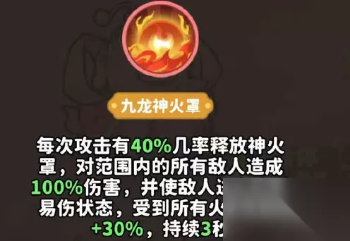 非常实用的火系增伤技能,开启九龙神火罩后,能让范围内敌人受到的火系伤害增加30%。 本文内容来源于互联网,如有侵权请联系删除。