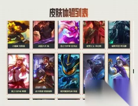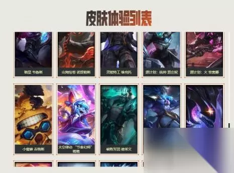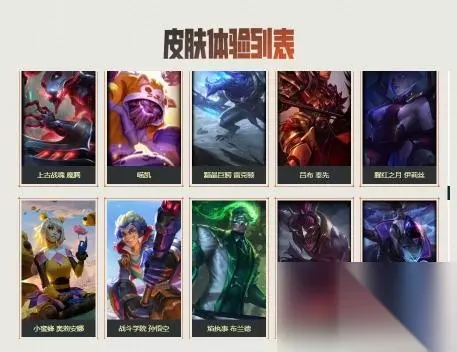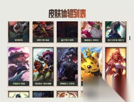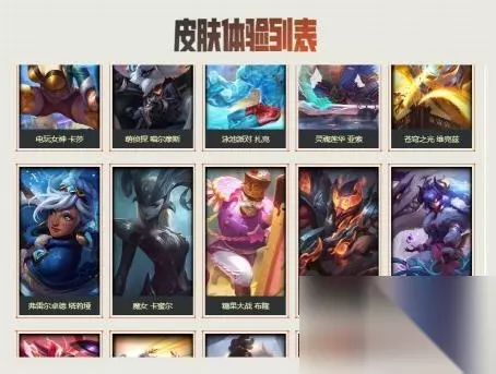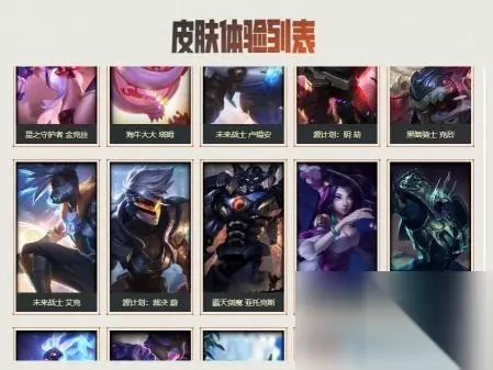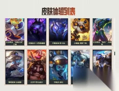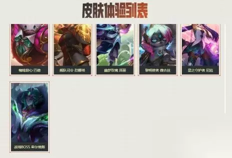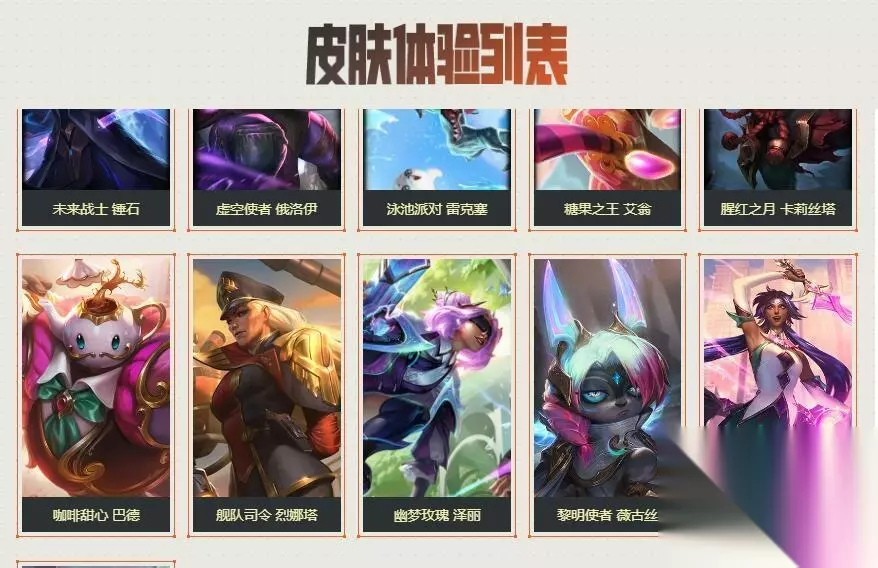 16.未来战士 锤石、虚空使者 俄洛伊、泳池派对 雷克塞、糖果之王 艾翁、腥红之月 卡莉丝塔、咖啡甜心 巴德、舰队司令 烈娜塔、幽梦玫瑰 泽丽、黎明使者 薇古丝、星之守护者 尼菈。如下图所示: