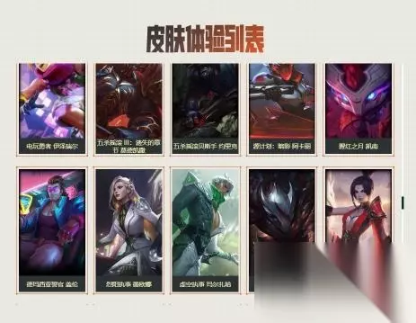 10.电玩勇者 伊泽瑞尔、五杀摇滚III:遗失的章节 莫德凯撒、五杀摇滚贝斯手 约里克、源计划:暗影 阿卡丽、腥红之月 凯南、德玛西亚警官 盖伦、烈阳执事 雷欧娜、虚空执事 玛尔扎哈、腥红之月 泰隆、玉剑传说 武剑仙。如下图所示: