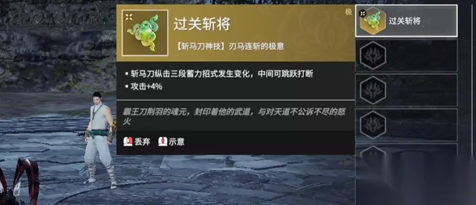 过关斩将是斩马刀专属的金色魂玉,它的核心用法是通过改变斩马刀的蓄力攻击形态来发动强力冲锋。装备此魂玉后,使用斩马刀进行蓄力攻击会进入斗气化马的特殊状态,角色将骑马向前方发起冲锋劈砍。这个状态下攻击力很高,具备强大的冲阵和控制能力,被命中的敌人会遭受连续伤害和长时间控制,在决赛圈威胁极大,且冲锋启动后具有无法被振刀的特性。