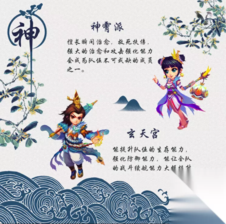 【神】 神族共有两个门派,分别是【神霄派】和【玄天宫】,永生不死、悲悯世人是他们的使命,是修仙的尽头和正果。擅长各种类型的治疗,乐善好施,救死扶伤,并能增加对于队友的攻击和生存能力。