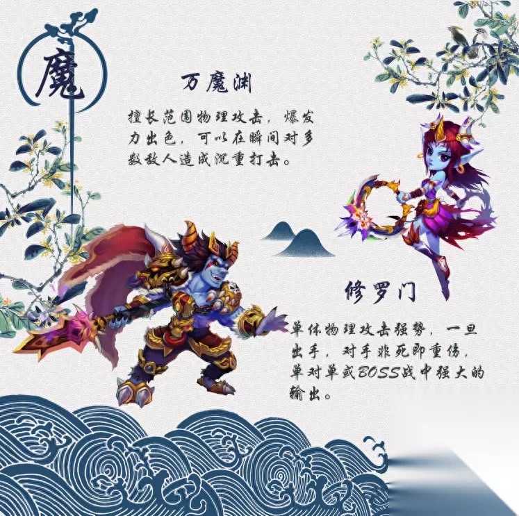 【魔】 不成佛,便成魔,来自【万魔渊】、【修罗门】的魔族,与神对完全立,追求力量,任性妄为。擅长物理攻击,拥有强大而高爆发的物理攻击能力。战争狂人、杀人机器、肉盾。