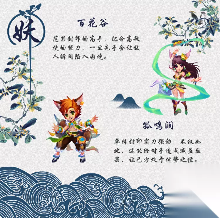 【妖】 顶着萌萌的大耳朵,谁看了不想摸一把,这就是来自【百花谷】和【孤鸣涧】的妖族,禽兽草木修炼可成妖,与世无争。擅长封印,行动讯敏,并且能对敌人造成减益效果。