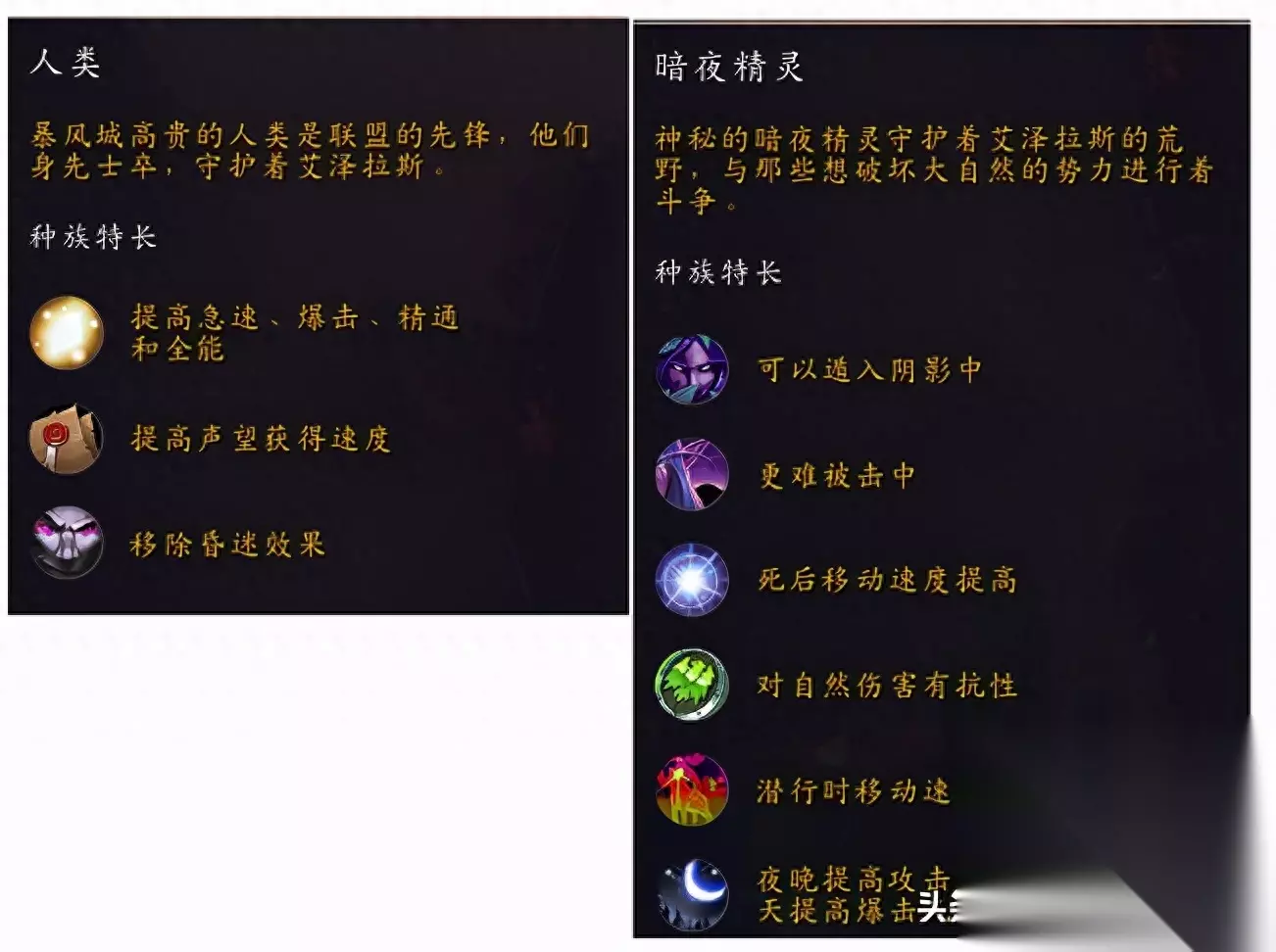 最近WOW的新版本《魔兽世界:暗影国度》即将开放,不出意外的话应该是2020年的11月24日(应该不会再继续跳票了,吧?),再加上“等级压缩”,未来又回到了60级满级的时代,同时练级时间大幅度降低,又有了“流放者离岛”这个做得还不错的新手场景,所以确实有一部分“新手”加入到了这款年迈的网游中来(论坛,贴吧最近确实多了一些问新手问题的帖子,练小号的时候也会见到不少没穿传家宝的,姑且就当是真新手吧)。 所以就想写下这篇指南,我尽量会以纯新手,也就是第一次接触到这款游戏,不过会有其他游戏基础的玩家视角来写,不过自己玩这款游戏也有不短的时间了,有的地方可能不太详细各位也可以留言提问。 在开篇部分最后想要说的一点是,希望新手们可以坚持到当前的满级(50级),然后体验这个游戏大部分的内容,结交到有趣的朋友,加入真正和善的公会吧,不要理会那些充满优越感的精英,也不要过分在意那些在社交平台上对你恶语相向的人,说实话他们都挺双标的,就像是我见过同一个人他说“我为萌新写了一篇攻略,希望能帮他们快速入门”,然后评论大多是“WOW现在哪还有新人哦”;后来他自己说“WOW是一款人气逐渐走下坡路的游戏”,评论区又阴阳怪气说“呵呵,魔兽第几次凉了?” 所以各位新手,当你觉得被冒犯的时候,直接无视那些恶言恶语就行了,任何游戏,甚至任何圈子都有这种充满优越感并且还玩双标的人。 下面咱们就进入正题吧 一、关于种族和职业选择 各位从下图可以看到,《魔兽世界》这款游戏分为两个阵营——联盟和部落,每边会有12个种族可以选,但很遗憾作为一个新人,每一边有5个“同盟种族”在最开始是无法选择的,初始可选择的种族联盟方是最左边那一列,部落方是最右边那一列,鼠标移动到对应的头像上可以显示种族名字,我就不一一做介绍了。但是要注意,每个种族都会有自己的“种族特性”,你可以理解为本族独一无二的被动或主动技能,这些特性在鼠标移动到对应种族头像上点击右键之后都会显示。