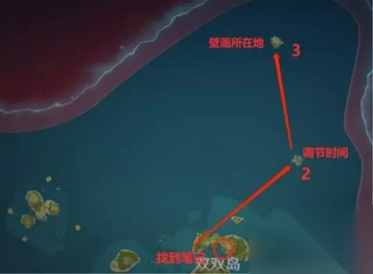 请使用传送门将您传送至双双岛所在的传送锚点,然后按照图中标记的方向前进。 该处壁画所在位置位于标记处下方的石壁上;