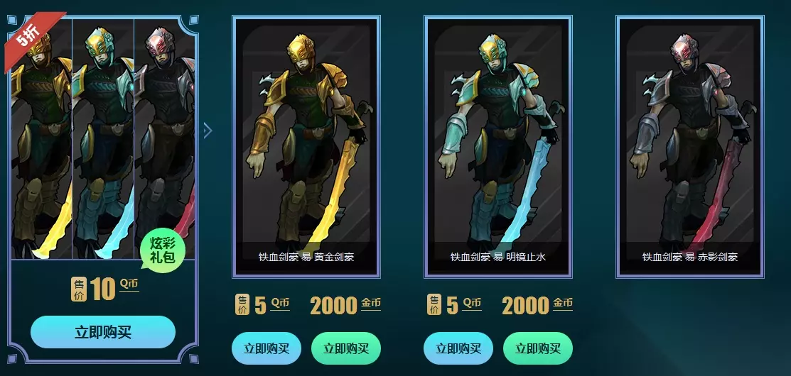 活动时间:2016年10月14日—10月27日 炫彩皮肤限时折扣及金币销售活动介绍 1、炫彩皮肤包以及炫彩皮肤使用Q币购买,限时五折;使用金币购买的炫彩皮肤也是限时的,只在10月14日—10月27日开放金币购买,金币用不完的小伙伴不要错过了。 2、在皮肤基础上的炫彩皮肤玩家需要拥有该款皮肤才能买这款皮肤的炫彩皮肤;在英雄基础上的炫彩皮肤玩家需要拥有该英雄才能买这个英雄的炫彩皮肤。 一、易铁血剑豪