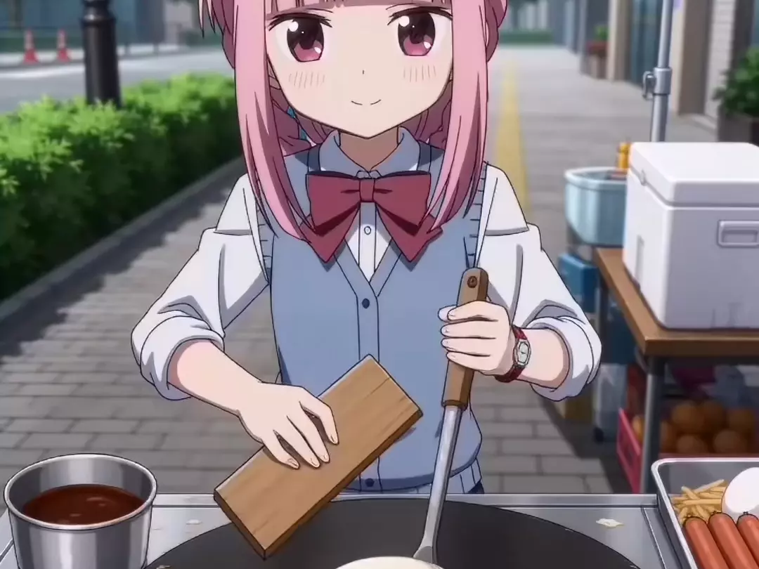 这是一张AI生成的二创图,呈现了游戏《崩坏:星穹铁道》中的角色阮·梅化身街头摊煎饼的Q版形象,和其他角色在“深渊”战斗的设定形成反差,画风趣味十足。