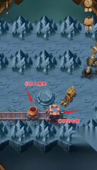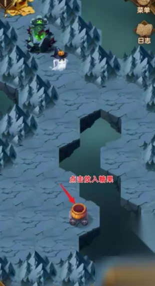 挑战后,来到第二个南瓜糖果罐的位置,移动到右侧后,放入糖果。