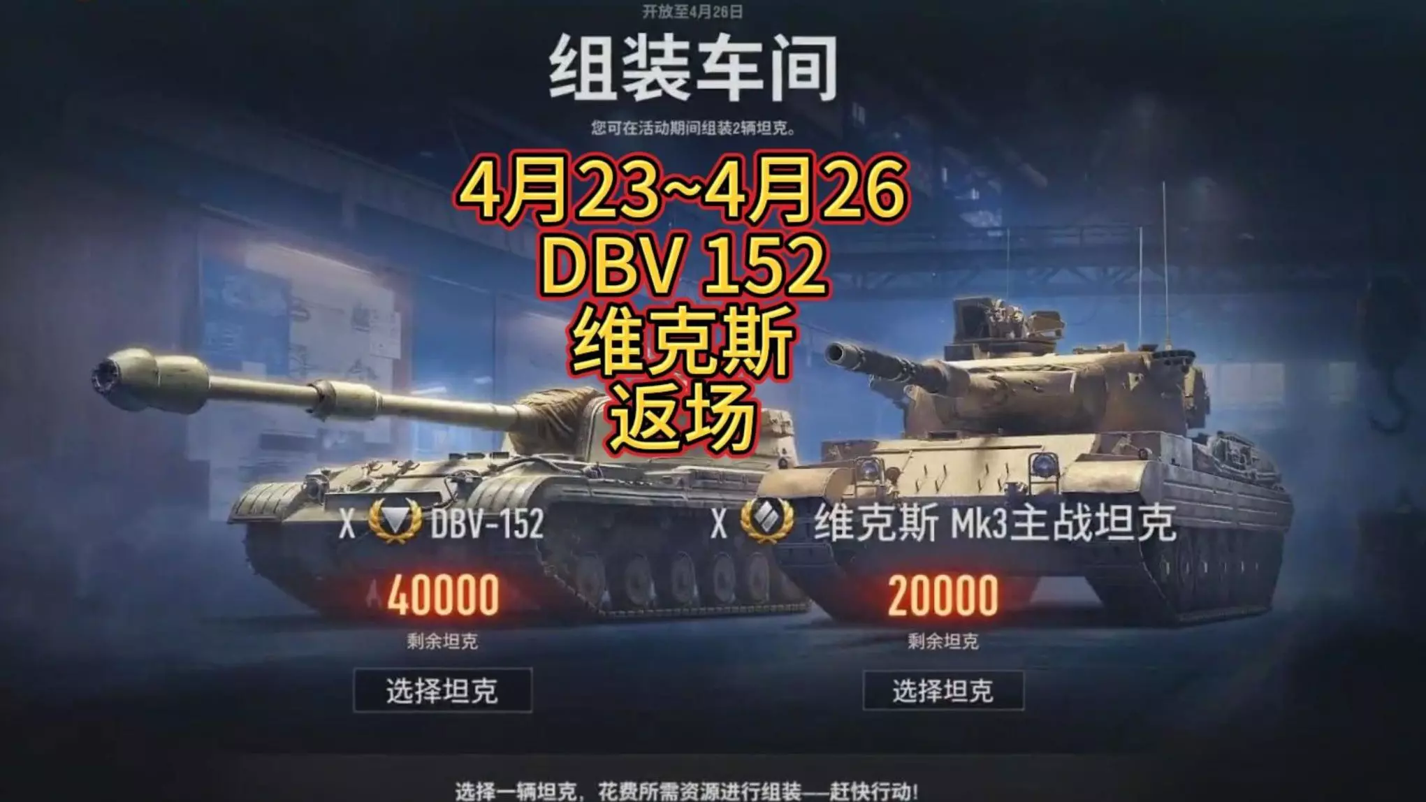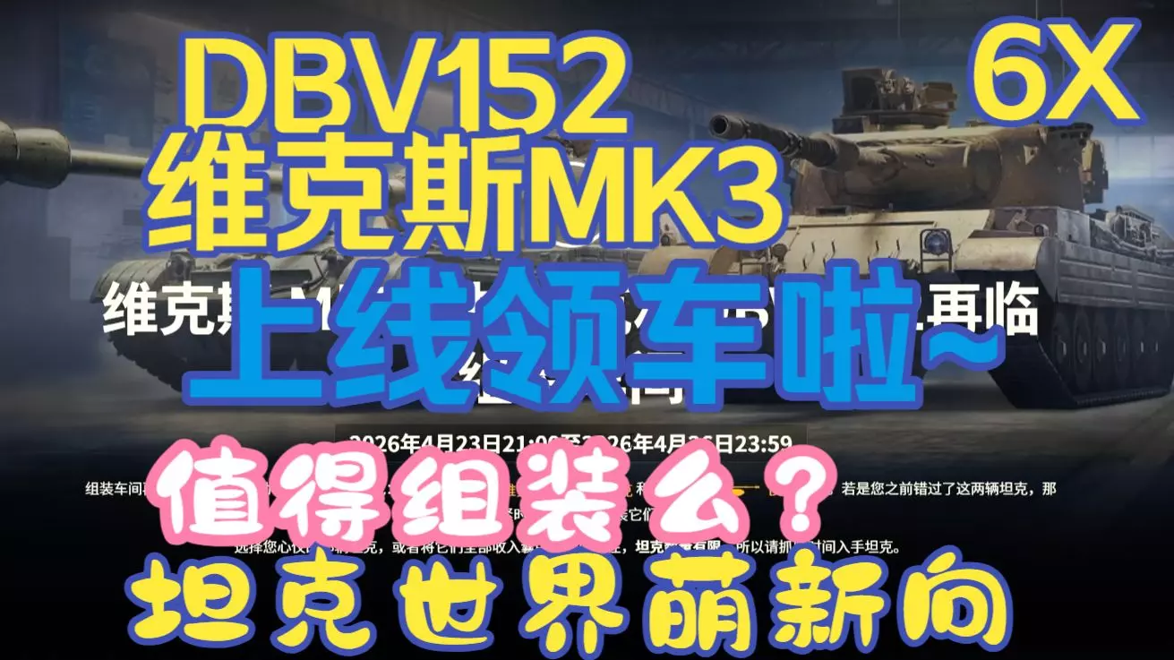 活动时间:2026年4月23日21:00至2026年4月26日23:59 组装车间再度开放,本次活动带来两辆经典坦克:维克斯 Mk3主战坦克 和 DBV-152…