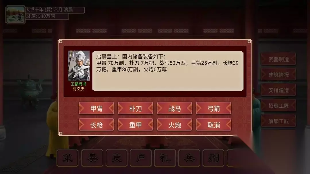 然后就是装备了,装备需要命令工部进行制造,每次只能生产一批装备,因此最好尽早开始做装备,每回合做一点。 部分高级的装备需要有建筑支持才能制作噢,因此别漏了建造各种建筑物噢,由于制作武器的建筑建造缓慢,而且需要3级才有新装备,所以推荐尽早着手建造。
