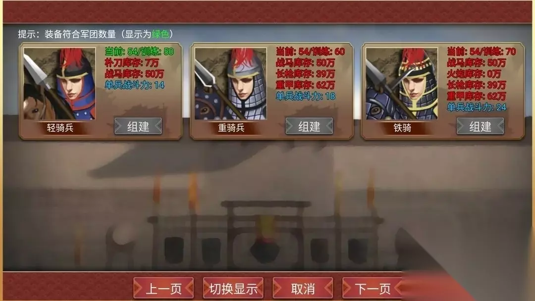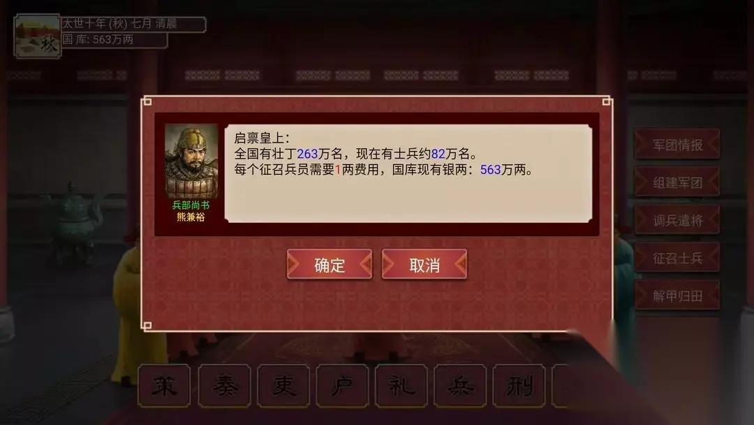 可以看到,在兵种选项中,绿色表示已满足条件,红色代表还未满足。军团的条件总共有两个,一个是训练度,一个是装备。 首先是训练度,要组建军团就要有壮丁,可以让兵部在全国范围内征召士兵。征召完士兵之后,点击加强训练可以进行练兵,每回合都有增长,速度比较慢。需要注意的是,每次征召士兵之后,都会导致训练度大幅下降,因此如果组建军团的需求比较迫切,切记要先等训练完成之后再重新征召士兵。