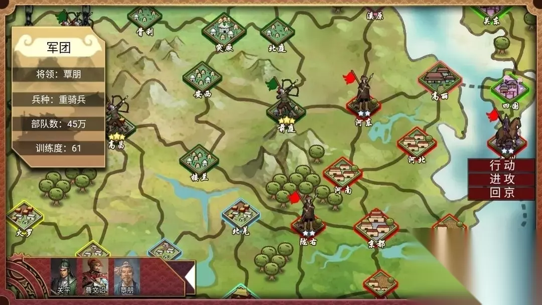皇帝成长计划2怎样打仗?皇帝成长计划2如何打仗?皇帝成长计划2怎样攻打叛军?皇帝成长计划2中玩家可以自定义组建你的战争军团,发展军事势力攻打其他国家,小编为大家带来皇帝成长计划2战争攻略,有需要的玩家可以点击阅读! 皇帝成长计划2战争攻略 点击兵部的组建军团,选派一名大将带兵。注意,大将的能力值很重要,武力和智力都会影响到军队的战斗力,智力高的大将还会使用计谋。同时记得野心不宜过高,忠诚度越高越好噢。