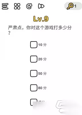 在脑洞大师手游中第九关完全是个送分题,相信不少玩家也都是已经过关了呢!还没过关的话,接下来就让我们一起来看一下吧! 脑洞大师第9关通关攻略 严肃点,你对这个游戏打多少分? 这还用说吗~想过关必须满分。