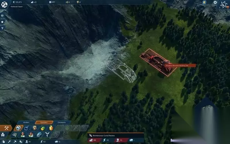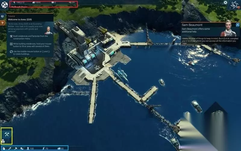 游戏界面左上红框从左到右是货币、物流、人口和生物资源。 左下黄框是修建和物流情况。 下方蓝框左侧是修建工具右侧是雇员、能源和物流数据。