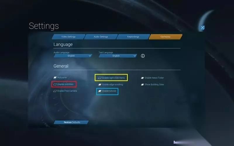 游戏设置界面中,红框显示字幕。 黄框开启右键菜单,蓝框打开教程。 其余可以用默认选项,都是方便操作和显示的。