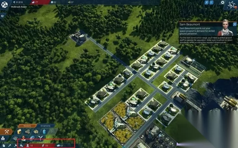 注意下方红框内区域。 如果出现负值就是说明工人、电力或是物流运力不足。 需要补充相应设施。