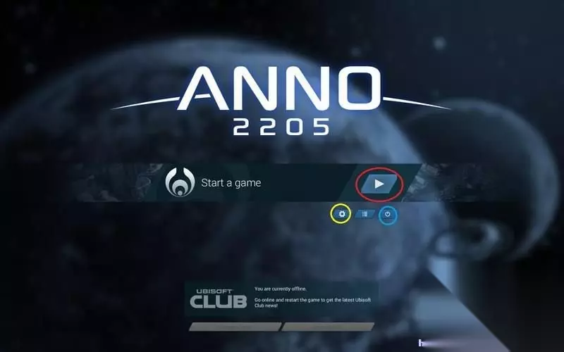 一、上手指南 1、基本要素 游戏主界面很简练,设计感强。 红圈是创建游戏或是继续之前的进度。 黄圈按钮是游戏的设置选项。 篮圈按钮退出游戏。