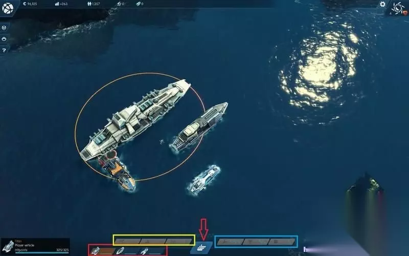 «567891011121314»友情提示:支持键盘左右键"←""→"翻页 战斗界面,箭头所示点击会全选所有战舰,红框则是各艘舰船的单独控制按钮。 黄框为增援选项,从左到右依次是区域导弹攻击、临时增援舰船和瘫痪地方设施。 蓝框为技能选项,一次是修理、防御和冲击――可以伤害敌人并推开敌人。