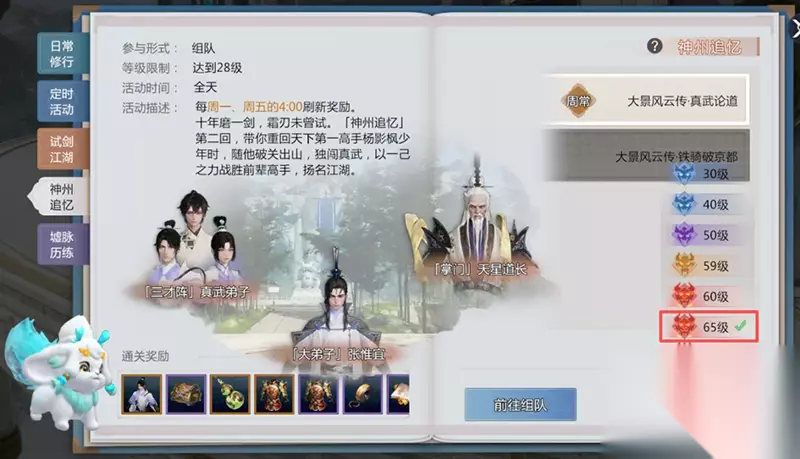 『首充双倍重置』 10月16日维护更新后,金锭充值首充双倍奖励次数重置。 ○ 重置后,每个档位金锭充值都可以享受首充双倍返利。 ○ 重置前未进行过首充的档位,其双倍返利次数不会保留,即不会在重置后触发2次首充双倍返利。 【功能优化、调整】 『领土争夺』 ○ 旗帜首占归属规则调整为:根据对旗帜造成的伤害排名决定首占归属。 ○ 领土争夺信息栏新增报点、召集功能:少侠进入旗帜范围内可使用报点功能快速报点。帮主、副帮主、长老可使用召集功能召集同一场景下的所有帮会成员。 ○ 优化领土旗帜名称。 『神州追忆』 ○ 铁骑破京都、真武论道开放65级难度。