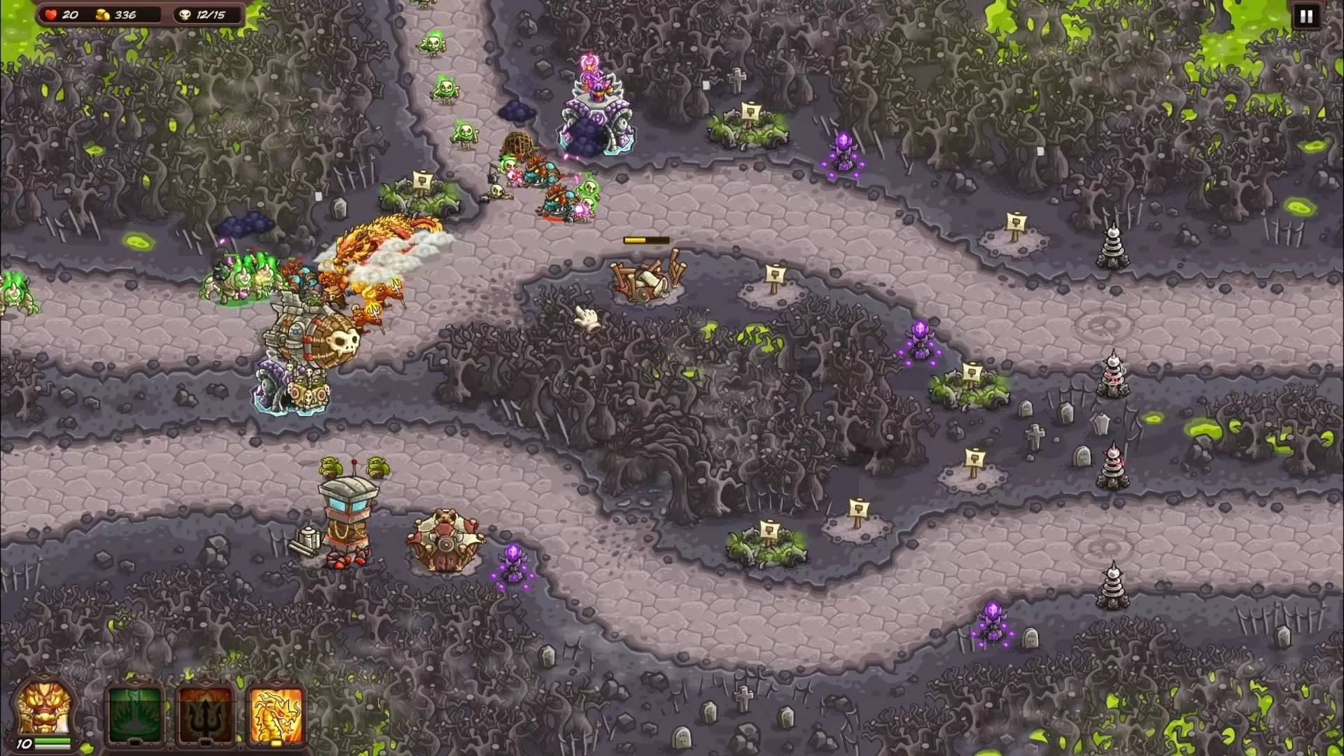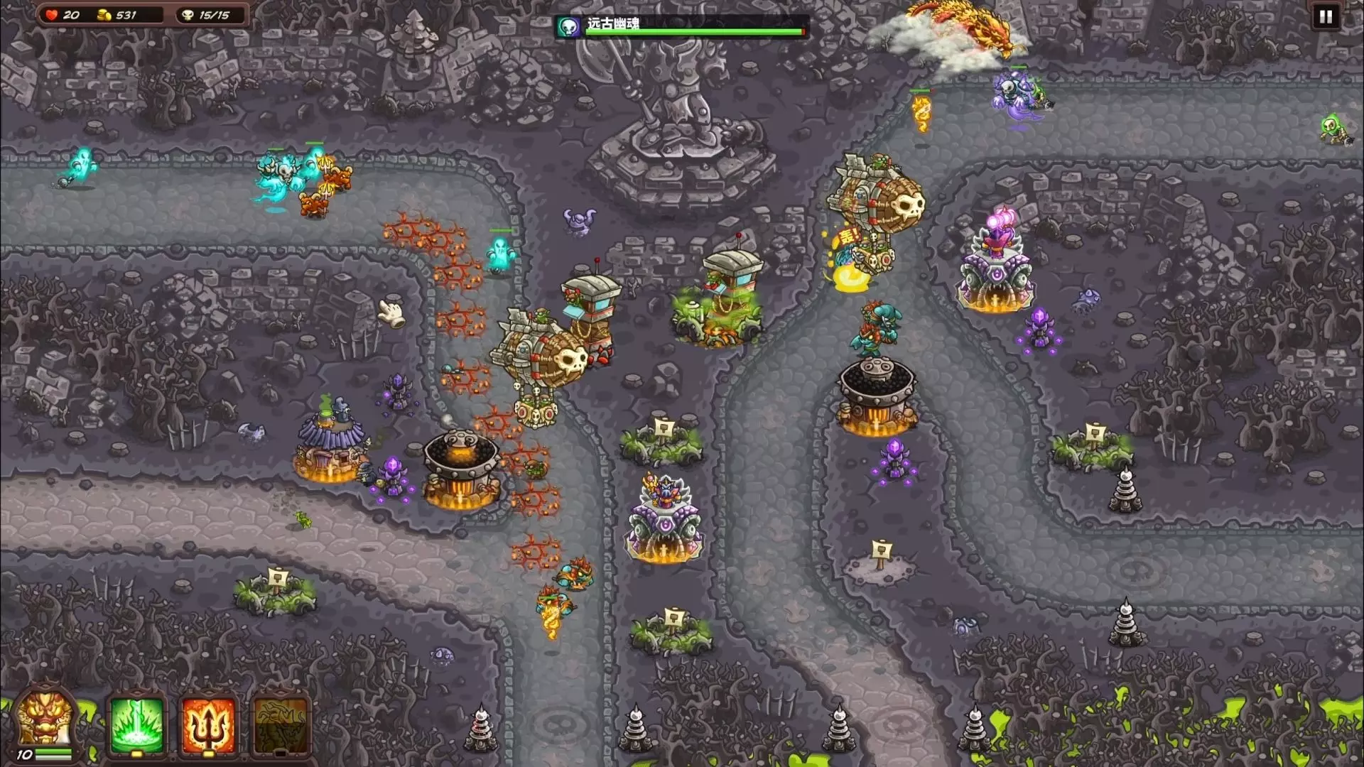 本关难度:极低 重开次数:0 要点:没多大改动的关,建议造鱼人塔,又能打骷髅又能打幽魂,腐朽的塔位就造飞艇和兵营,非常简单的一关