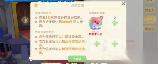不过在添加邻居的时候是有要求的,那就是必须双方的好友度达到二百点,然后摩尔的等级达到十五级,农场的等级也必须是十级之后才可以去找尼克行政官进行申请的。成为邻居之后两个人就会有共同的储物箱,可以把双方的东西都放到里边进行分享,然后彼此去照顾庄园。若是后期双方因为其他事情不能在继续关系的话,那么也是可以去找尼克接触关系的,单方面接触的话是要消耗摩尔豆的,若是双方都提交接触的资料的话,那就是免费的。不够好不容易有自己的邻居能够彼此照顾庄园,在时间和其他方面形成互补的话,玩家们建议大家不要轻易的接触关系哦,