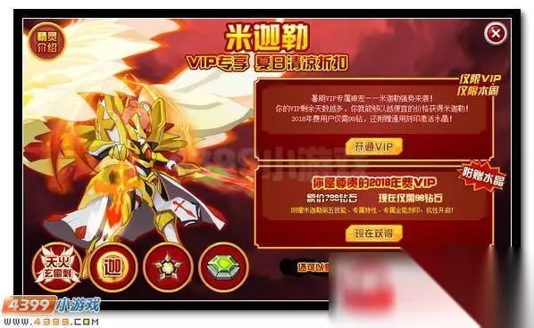 手握神圣之荣光,赛尔号正义使者米迦勒!他是正义的使者,身披金色之羽,手握神圣之光。行过之处,是满腔的傲气凛然。光明米迦勒荣耀登场! 活动时间:7月20日开启 活动奖励:米迦勒 活动入口:最新活动-VIP专属神宠米迦勒。 原价798钻石精灵,VIP天数越多价格越便宜。2018年年费赛尔可98钻石获得~只限一周时间!