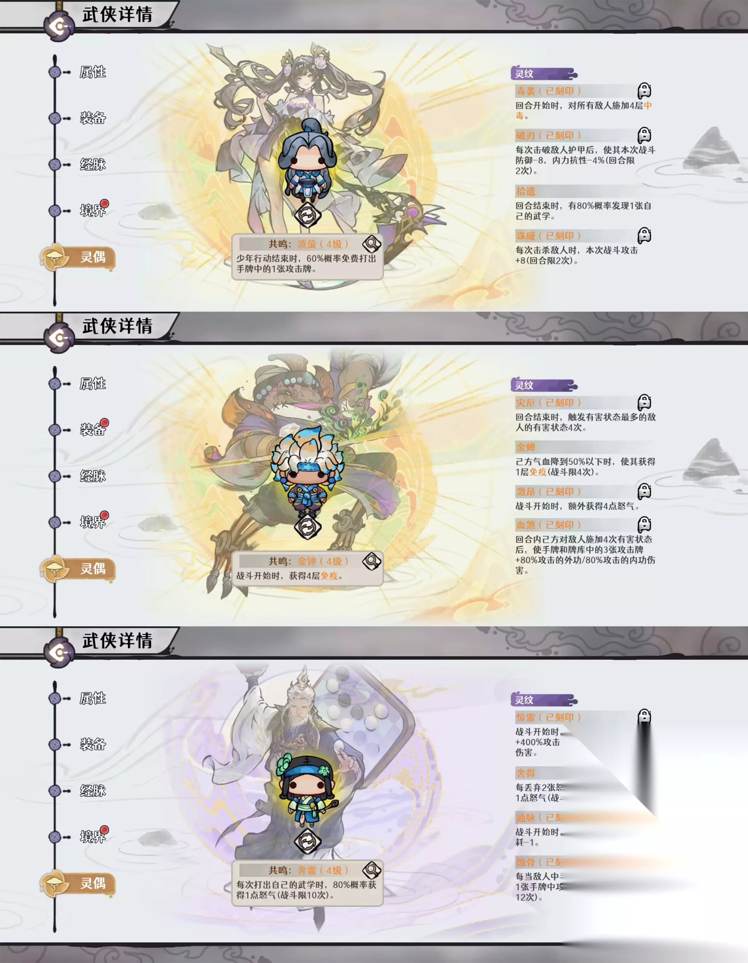 Tips: 豪侠的【共鸣】选择:【金钟】,和【灵纹】选择【金蝉】与【激昂】。个人理解是必备的顶级保命和辅助的选择。 3.紫镰毒流阵容