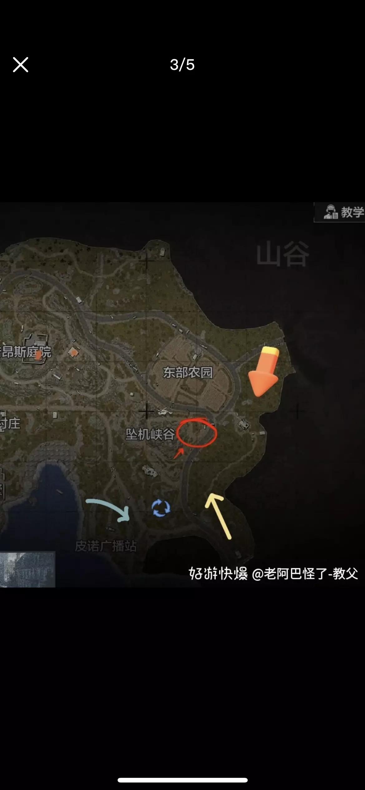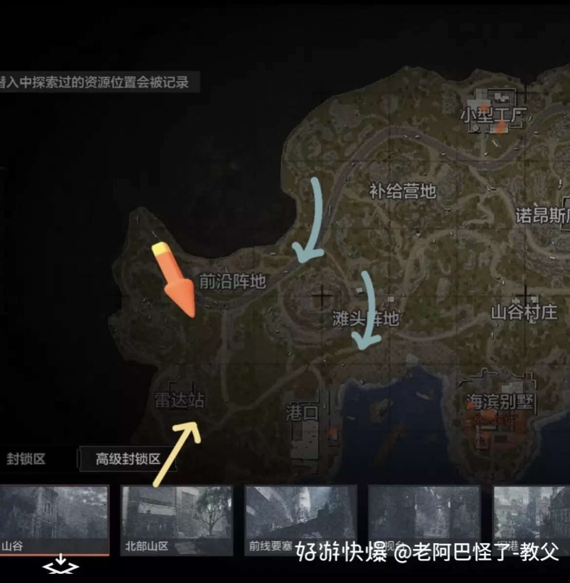 首先是起装,一般是满改枪加五级套六级套,头戴t7热成像。子弹方面推荐肉蛋、四级、五级。 打保卫,建议远距离发挥热成像优势,肉蛋打击。 打特遣,如果看见对面也是t7,马上换高级子弹,直接架点,不要漏。 注意,特遣刷新点的附近刷新点不会刷多斯。 接下来说一下地图各个出生点的开局打法 风云再起地图左面有四个出生点(黄色箭头包括了雷达和港口出生点) 从橘色箭头出生的队伍,先架雷达站出生点的人,另外多斯有概率刷港口,可以架完雷达站撤离点再去港口打多斯,留一个队友架补给营地附近出生点预防万一。 从黄色箭头出生的队伍(包括出生在港口的),先架从前沿阵地过点的敌人 从上方蓝色箭头出生点出生的队伍(最上面的箭头,下面的箭头为第二路线),可以开局直接加前沿阵地,或者去滩头阵地架港口的敌人。 把左边图清理干净 可以去补给营地,根据图片,可以在补给营地山上大石头架住, 小型工厂左山 小型工厂右山 诺昂斯庭院左狙山和下方靠左的山上。 橙色箭头出生点的队伍,开局往下走架黄色箭头出生点,不要开局直接去别的地方,导致被黄色出生点的人偷屁股。 黄色箭头出生点的队伍开局往上反架,避免被橙色偷屁股,橙色出生点打完再去坠机峡谷架蓝色出生点 蓝色箭头出生点的队伍,切记不要直接冲别墅,因为这张图爆率并不高,主要还是靠打人挣钱。 所以开局上皮特广播站反架黄色出生点,然后跟上面的一样,往上走架橙色,确保没人偷屁股。 千万要注意开局不要去红色⭕,去了就是怨种,热成像看的清清楚楚,还没有掩体,纯纯挨打位置 确定好右面出生点没人了,就可以去诺昂斯庭院了 里面地形较为复杂,山上山下如果架不好的话很容易被偷屁股,所以一定要做好团队沟通 去到庭院后可以架到 山谷村庄 滩头阵地过来的敌人 补给营地大石头 小型工厂 切记一定要做好团队沟通,确保队友死掉第一时间能架到队友包,避免队友热成像被捡走(当然你死了你也希望队友把你热成像带上) 这就是本次风云再起的全部攻略了,如果有什么纰漏,欢迎大家在贴下补充交流,再见#暗区突围