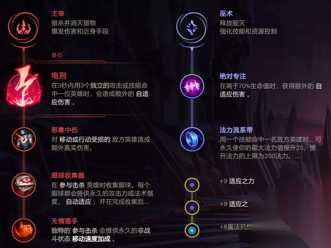 中单安妮的基石符文,推荐选电刑来提高爆发。由于安妮的都是在有眩晕时发动进攻,恶意中伤也能提升不少伤害。安妮拥有稳定控制,游走能力也很强,由于自己本身没位移技能,所以最后一个选择无情猎手,提升机动性 副系带巫术系,法力流系带确保蓝可行用。作为开团手,建议搭配绝对专注,提升满血时的属性,强化开团时的爆发