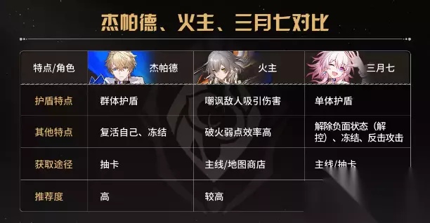 当然了,除了奶妈,生存位也可以选择盾辅。部分输出角色(克拉拉、彦卿、阿兰)对盾辅的需求比奶妈更高。1.0版本的盾辅目前只有三位角色,分别是“杰帕德”、“三月七”和“火主”(需要通关贝罗伯格的剧情才能将物主转换为火主)。 其中杰帕德是群体护盾,三月七是单体护盾,火主是嘲讽(吸引敌人攻击自己),各有优劣。杰帕德对萌新更友好,有大开大,可以说是星穹铁道版“钟离”,安全感拉满。三月七和火主的保护能力要稍差一点,但是功能性、机动性更强,需要有一定游戏理解才能发挥更好的作用。 对萌新玩家而言,有杰帕德用杰帕德,没有再考虑火主,最后再考虑三月七。 3)什么时候选奶妈,什么时候选盾辅? 大多数情况第一个角色都是选奶妈,但是如果主c(克拉拉、彦卿、阿兰)对盾辅有特殊要求就先选盾辅。 2、第二步:挑选输出角色 1)根据环境来选输出角色 基本的生存能力满足之后下一步我们要考虑的就是输出了。一个队伍里通常会配有1~2名输出角色,前面咱们也提到过,输出角色根据命途不同又分为巡猎(对单)、毁灭(对单对群)和智识(对群)。那么我们应该怎么选呢? 答:根据环境来选。