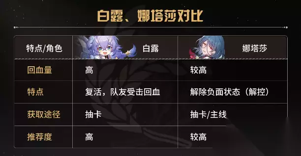 1.0版本目前只有两个奶妈角色,分别是“娜塔莎”和“白露”。白露的回血量要高于娜塔莎,而且带有复活功能,所以对萌新玩家而言,白露的游戏体验无疑会更好,有白露选白露。不过娜塔莎也是有自己的特长的。她的战技带有驱散能力,用于给队友解控也是极好的,功能性相比白露要更好一点。因此对于有一定游戏理解的玩家而言,娜塔莎有时反而能打出更好的效果。 2)盾辅如何挑选?